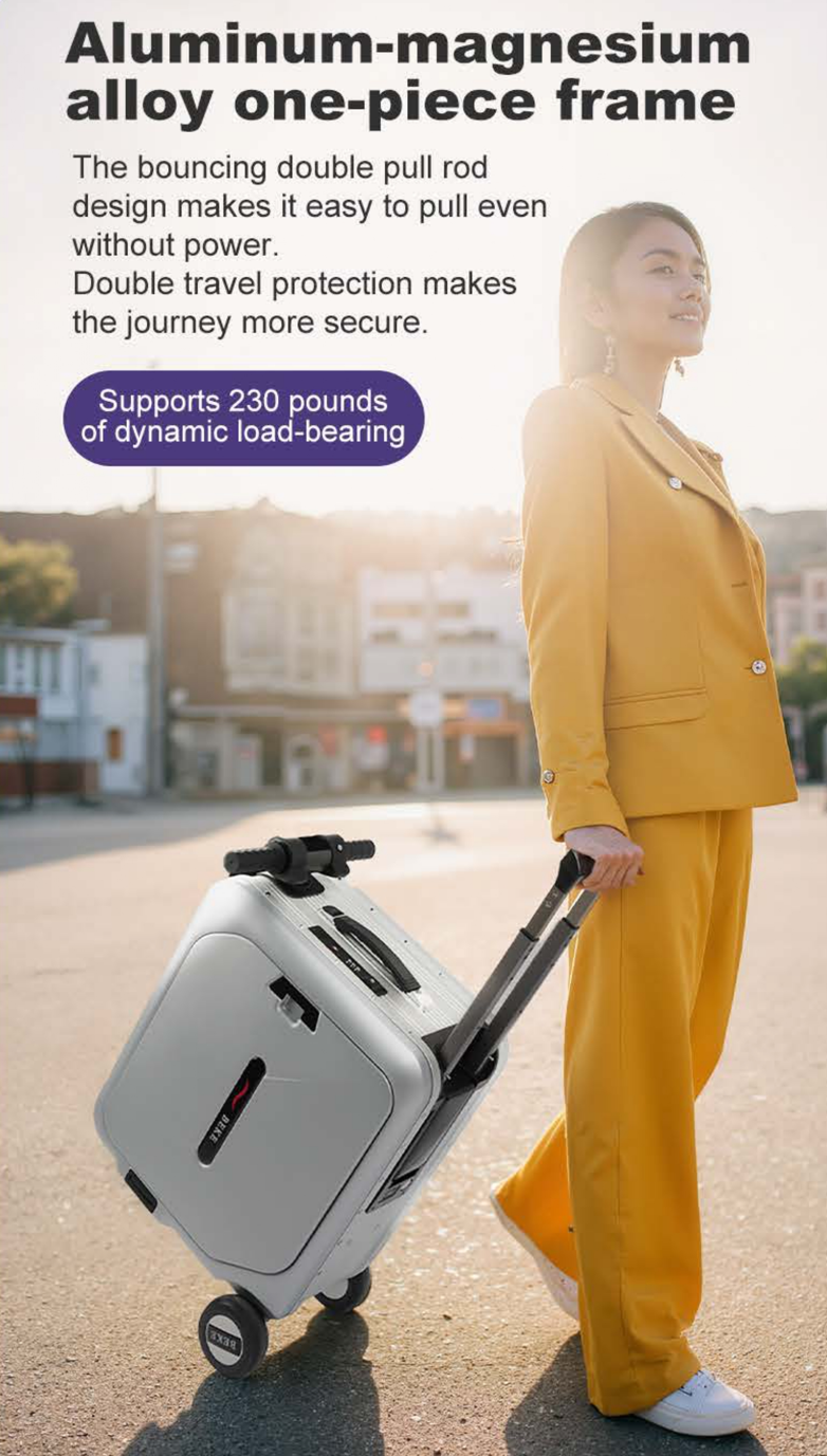 Our BEKE Rideable Suitcase blends cutting-edge tech with sleek aesthetics for a premium travel experience.